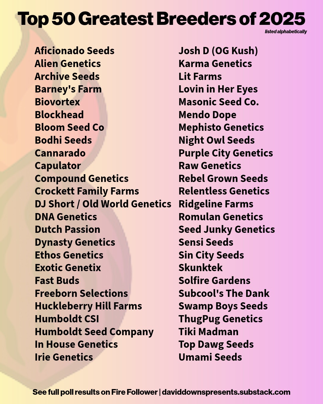 One week of elite cannabis genetics coverage straight to your inbox. This issue contains actionable seed drop intelligence, clone picks, breeder news, and more. From award-winning cannabis journalist and best-selling author of ‘Marijuana Harvest’ David Downs—2025 Mendo Cup Judge, 2025 Leaf Bowl Judge, and 2026 Autoflower Cup Judge. Downs’ writing appears in High Times, Leaf Magazine, GreenState, and has appeared in WIRED, Rolling Stone, New York Times, The Onion, and Scientific American.